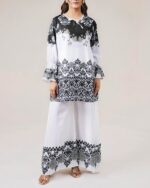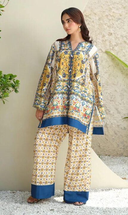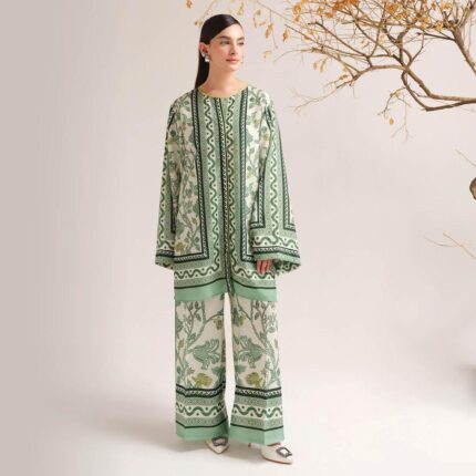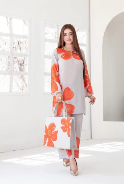 Elevate your style with our stunning coord set. Featuring an exquisite print on top with border style print on bottom. this beautifully crafted two-piece set includes: Top with over all print and bell style sleeves bottom with print on bottom perfect for all occassions fabric fine creape size free size