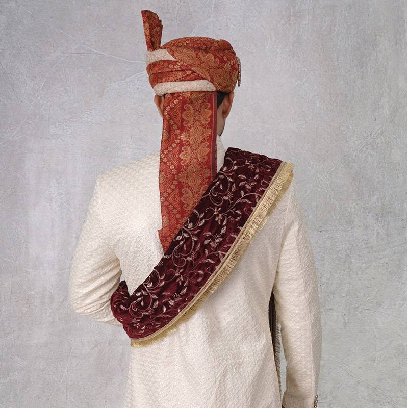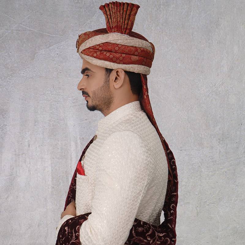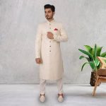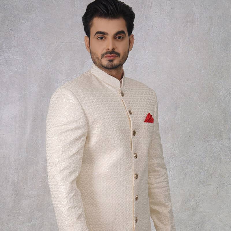 This Font sherwani with matching combination of black karhai n sequence stones is crafted from raw silk with black thread karhai. Whether its your main wedding day or a royal reception, this is the ultimate option.