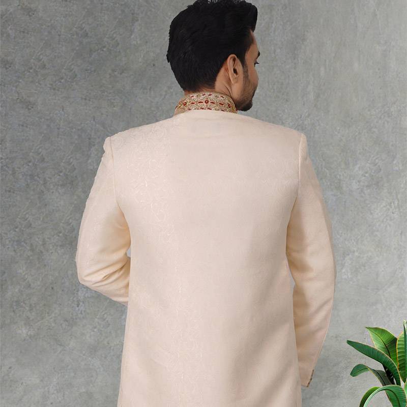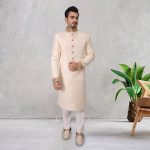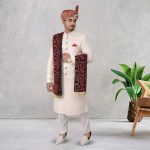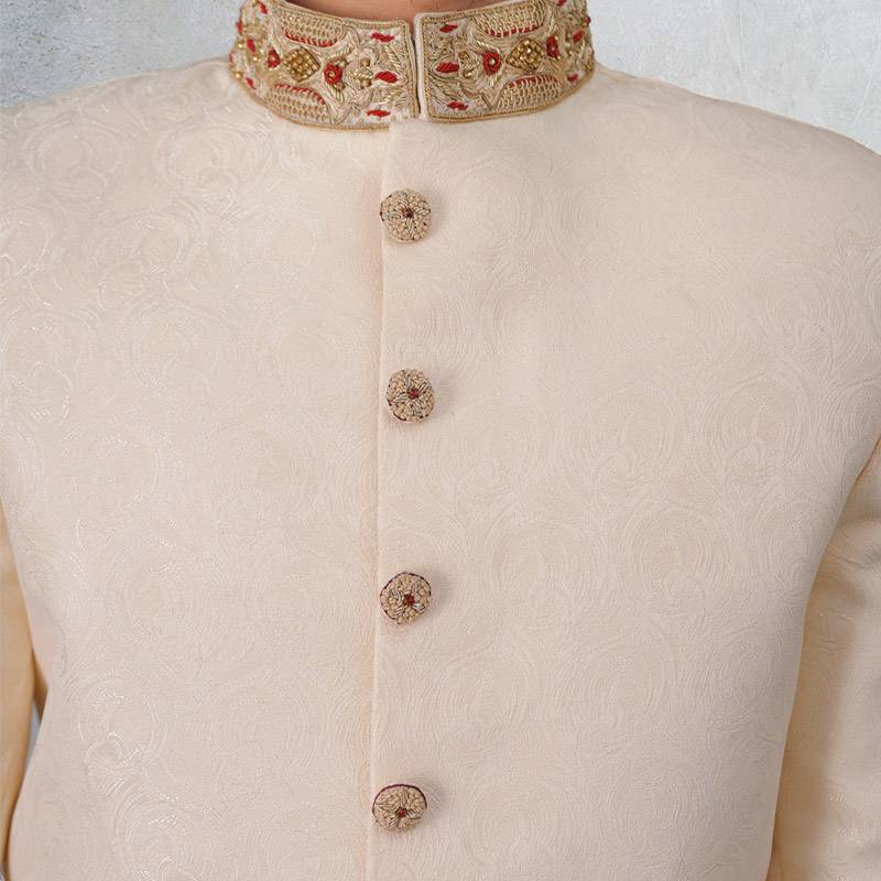 This Font karhai sherwani with matching combination of black karhai n sequence stones is crafted from raw silk with black thread karhai. Whether its your main wedding day or a royal reception, this is the ultimate option.